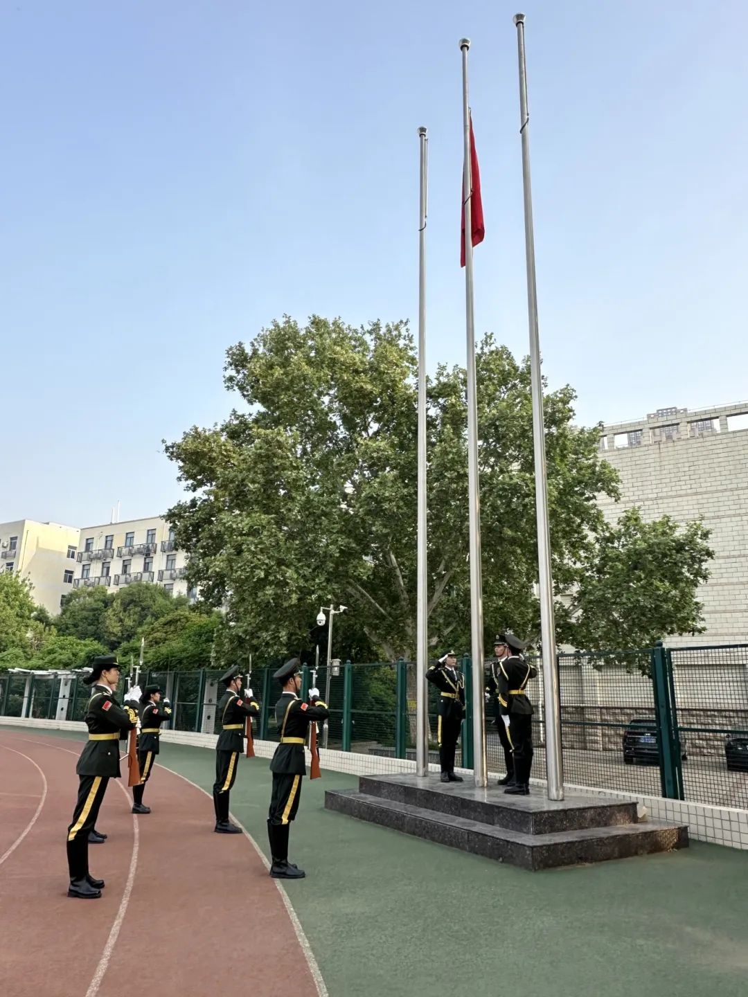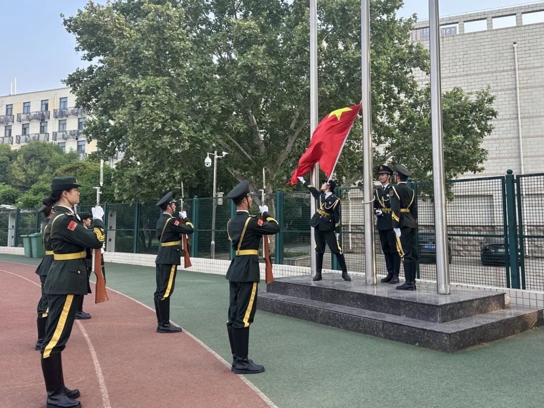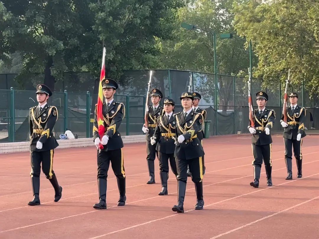 国旗护卫队迈着整齐有力的步伐护送国旗进场,在庄严的国歌声中,鲜艳的五星红旗冉冉升起,全场静默,面向国旗行注目礼。