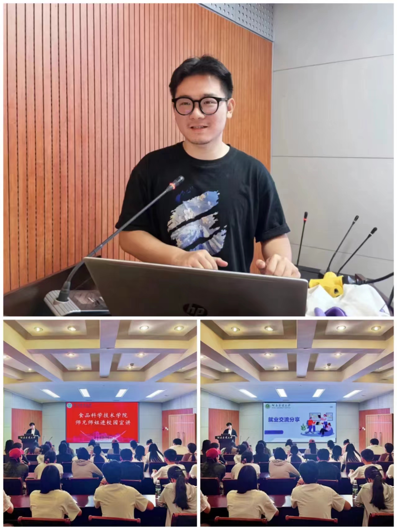 会议伊始,胡雪源首先分享了自己的职业目标规划、求职心路历程,以及最终入职中央储备粮上海直属库有限公司的成功案例。他表示,要充分做好前期准备、信息收集工作,积极拓展就业渠道、打开思路和眼界,在关注校招的同时,多关注查找大型国企等网络招聘信息。同时,他以自身经历为例,向同学们讲述了国企招聘中的笔试和面试经验,鼓励同学们积极争取,尽早着手,抓住机遇。并建议同学们对未来的规划不可好高骛远、脱离实际,要将自身实际情况与目标相结合。最后,他希望同学们都能找到自己心仪的工作岗位,前程似锦、未来可期。