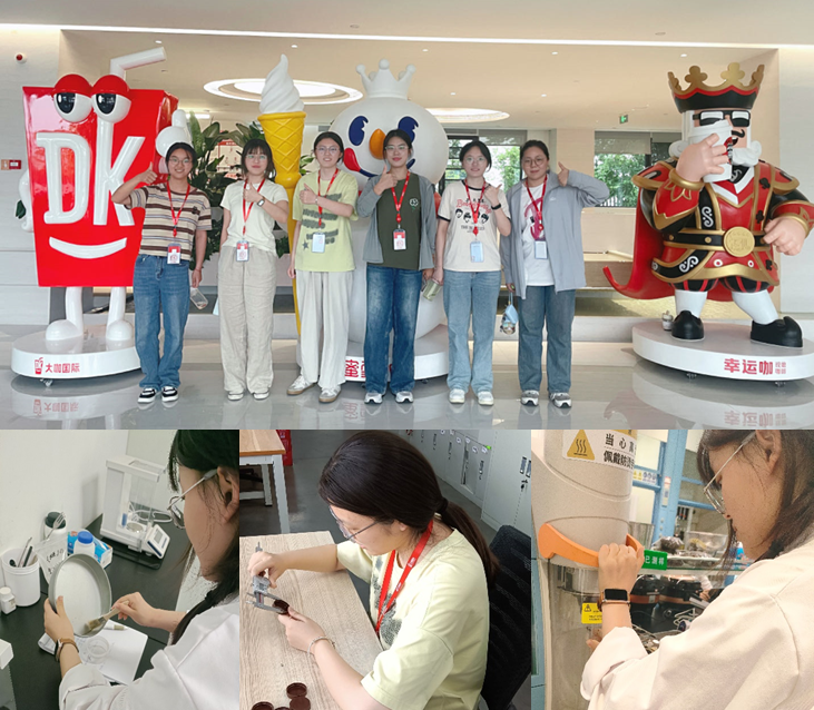 在大咖国际生产实习的同学们进入企业后,企业负责人带领大家参观了咖啡、奶茶、果茶、果酱等生产线,对蜜雪集团的原料生产、品质控制、科技研发、品牌运营、企业培训等进行了简单介绍。实习同学分别被安排在品控的不同岗位,参与了产品的质量检测和控制工作,学习了如何运用先进的检测设备和方法对产品进行准确评估。通过实习,学生们不仅提高了自己的专业技能,还增强了对食品安全和质量控制重要性的认识。