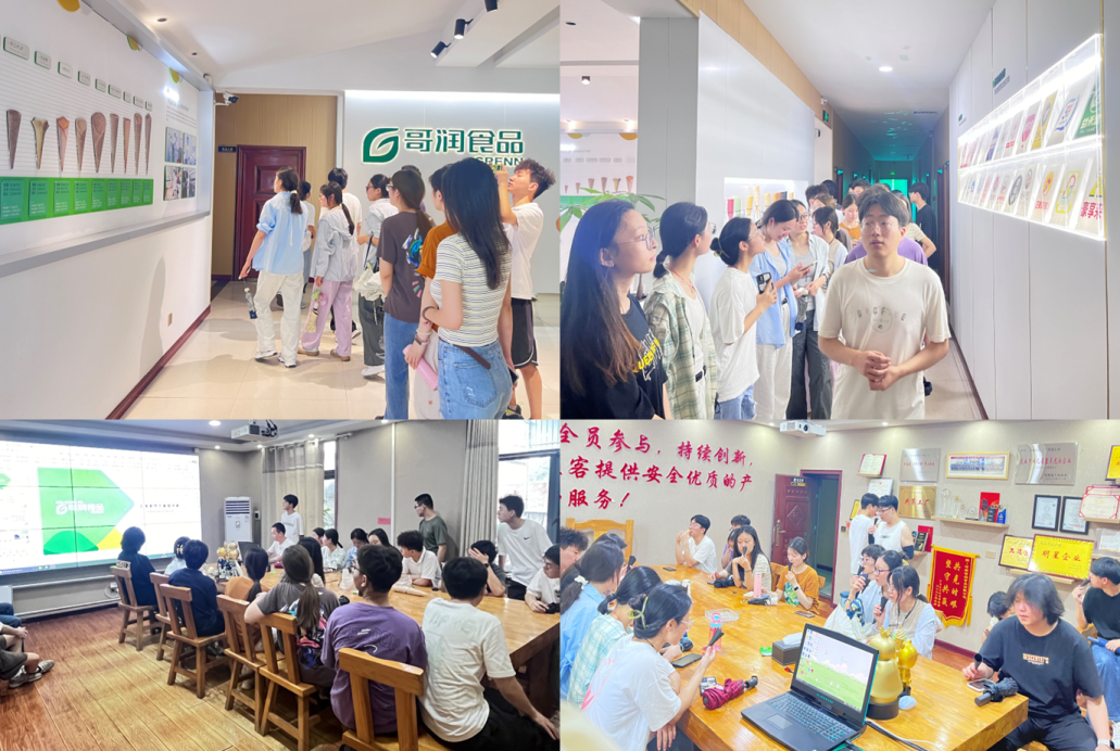 18届毕业生袁鹏博,现任哥润研发经理,带领同学们参观冰淇淋脆筒生产车间生产线,并实地讲解厂区各个功能区的分布以及企业概括和发展现状,同学们也品尝了新鲜出炉的黑芝麻脆筒。大家在参观的过程中学到了很多知识,学长的教导也指明了同学们未来努力的方向。