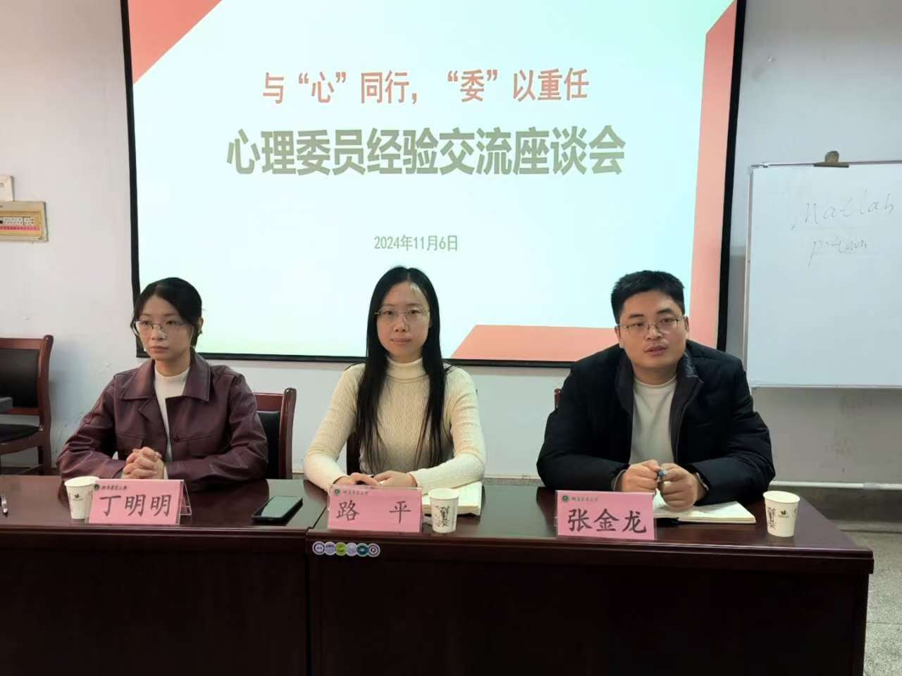 于文化路校区17号楼405召开“与‘心’同行,‘委’以重任”——心理委员经验交流座谈会,院团委书记路平、院团委副书记张金龙、24级辅导员丁明明出席会议,23级、24级全体心理委员参加,此次座谈会由院团委副书记张金龙主持。