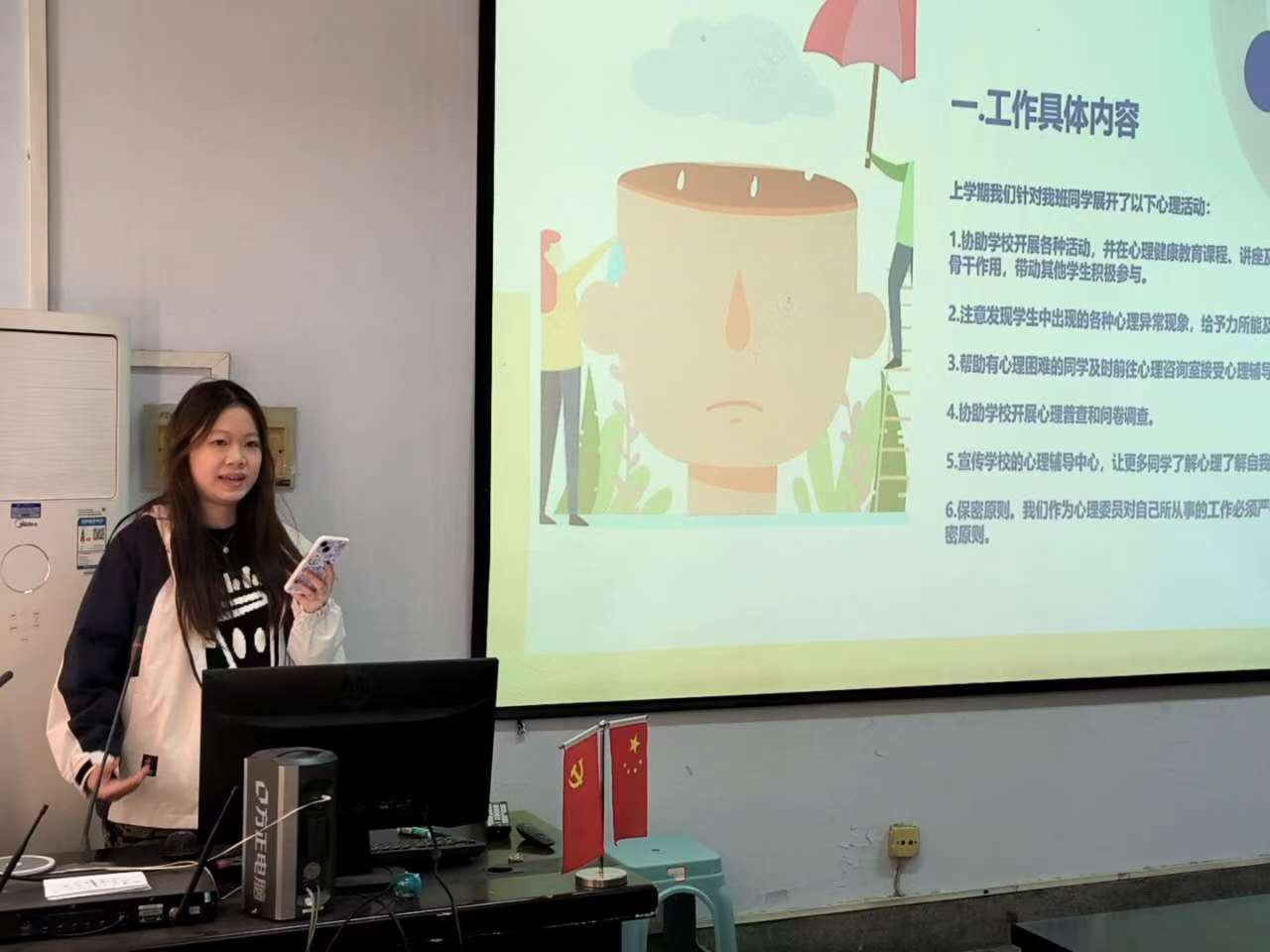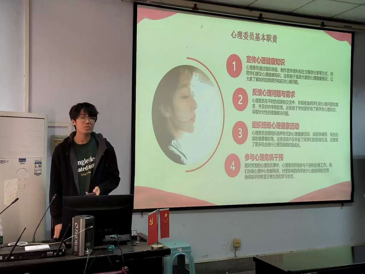 会议伊始,心理委员代表依次上台发言。张硕洋分享了心理委员的职责、在班级中的作用、目标设定等方面的相关经验;董恩妤则展示了自己的工作风采,并鼓励大家积极参与澳门银河App