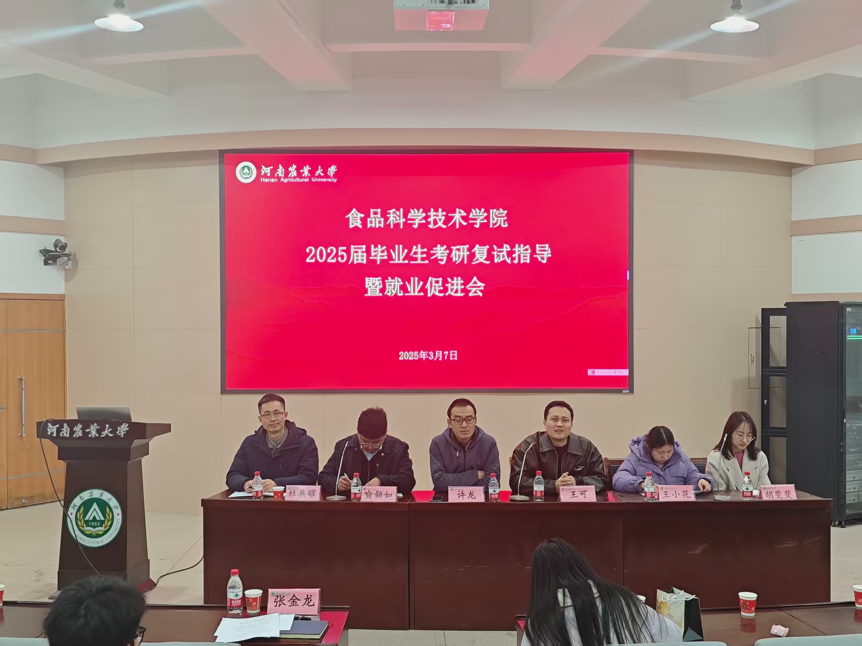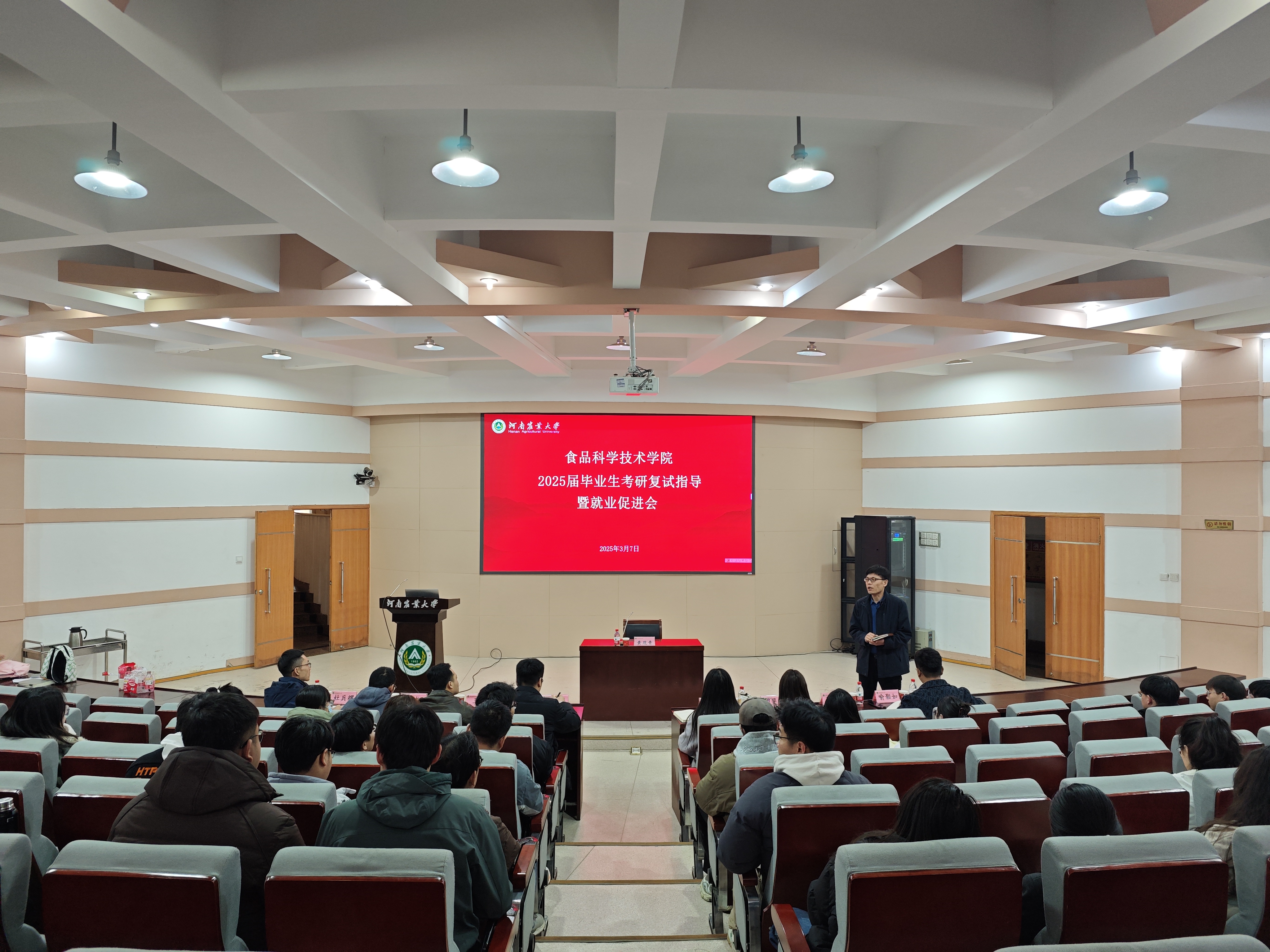 于文化路校区300人报告厅举办2025届毕业生考研复试指导暨就业促进会,院长黄现青,院团委书记路平,食工系教师代表王可、王小花,食安系教师代表杜兵耀,营养系教工代表许龙、喻颢如、胡斐斐出席会议,2025届毕业生代表参加。此次会议由院团委副书记张金龙主持。