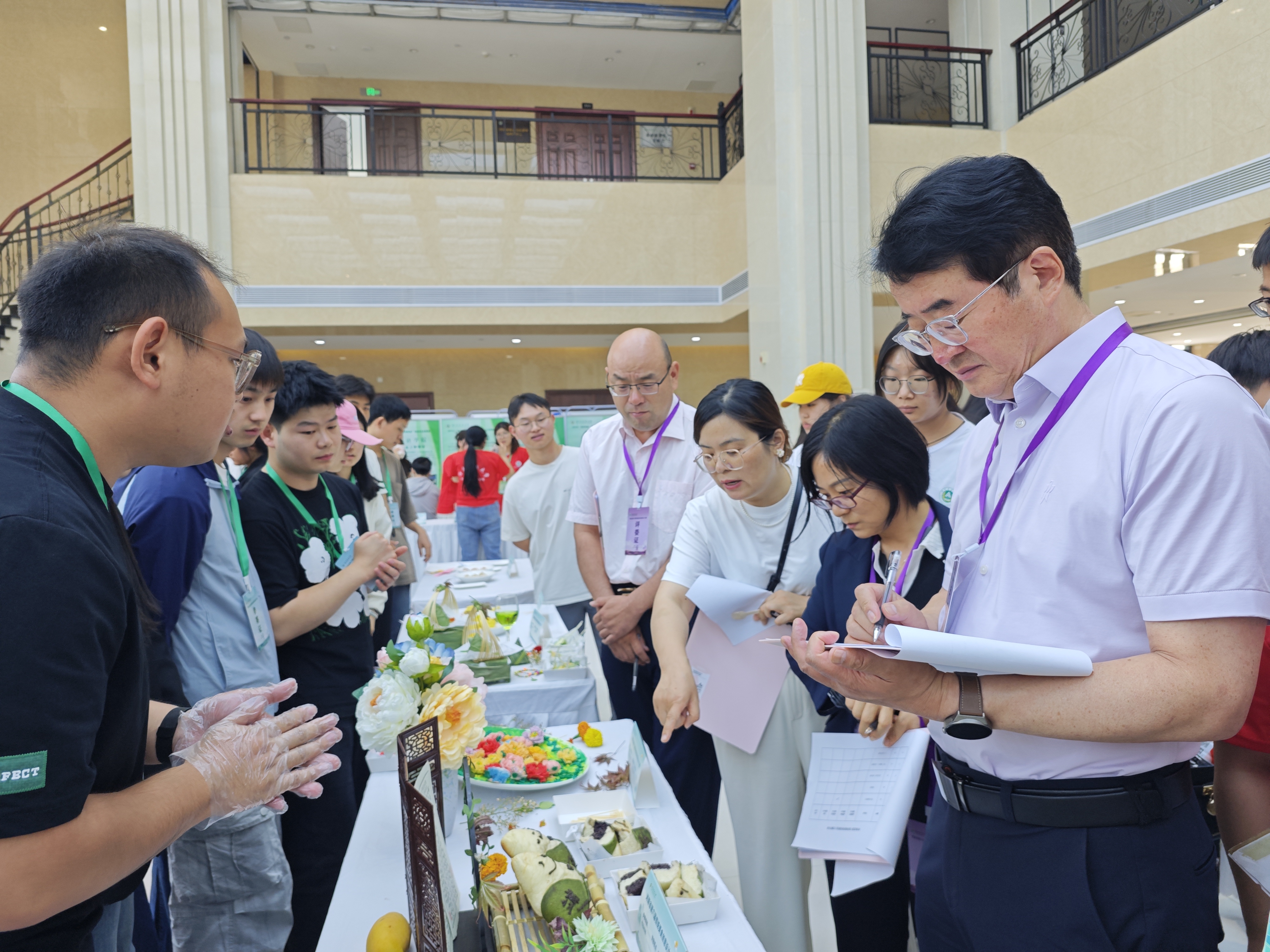 比赛期间,选手们详细介绍了菜品中的食材与烹饪技巧,评委们与参赛选手交流制作理念,对各个产品的创意特征、营养特点等方面进行评分。评委们对选手们勇于创新的精神给予肯定,鼓励选手们继续挖掘传统美食的潜力。在比赛中激发大学生对传统饮食文化的热爱与探索精神,推动传统美食文化在年轻一代中的传承与创新。
