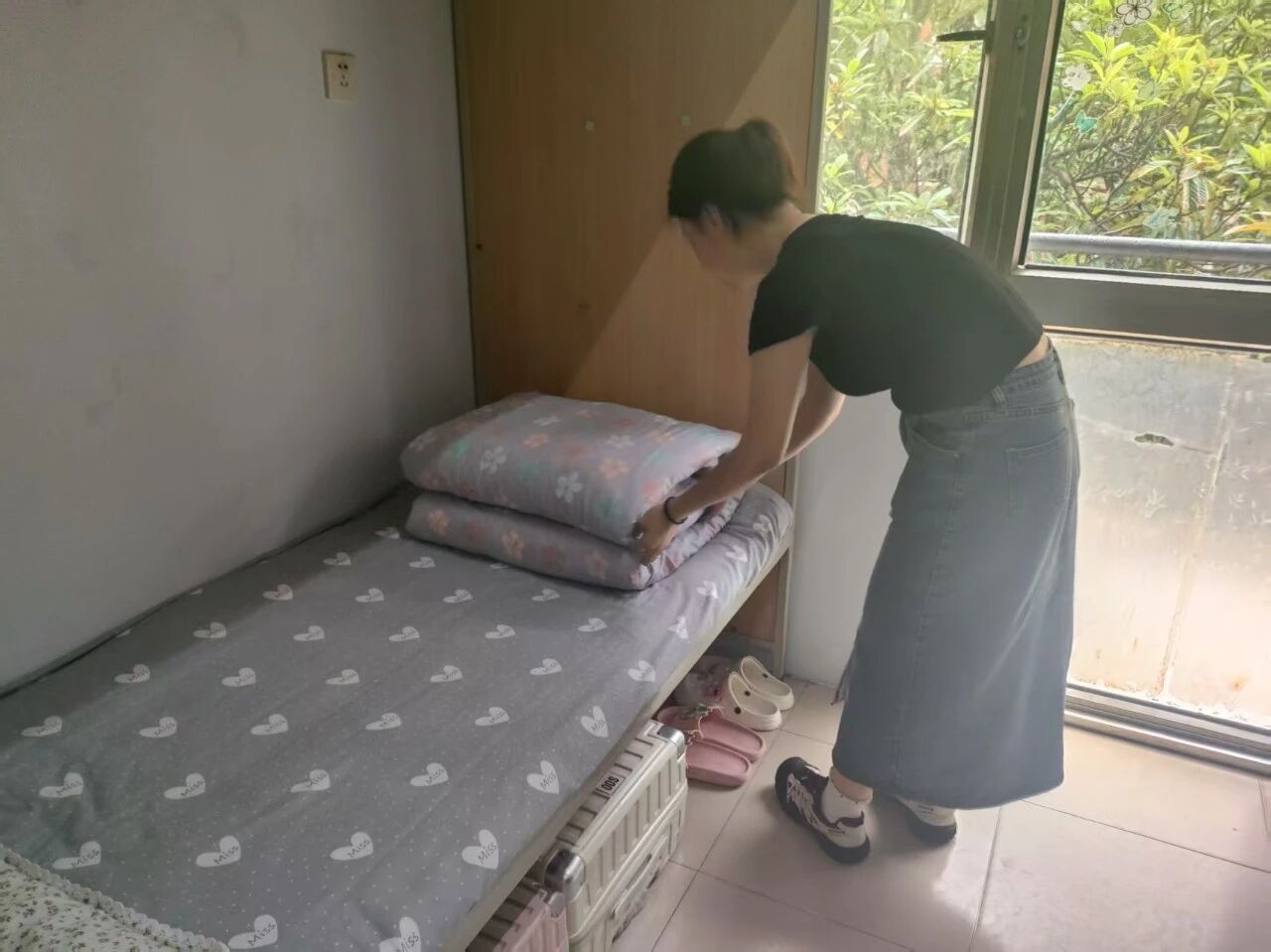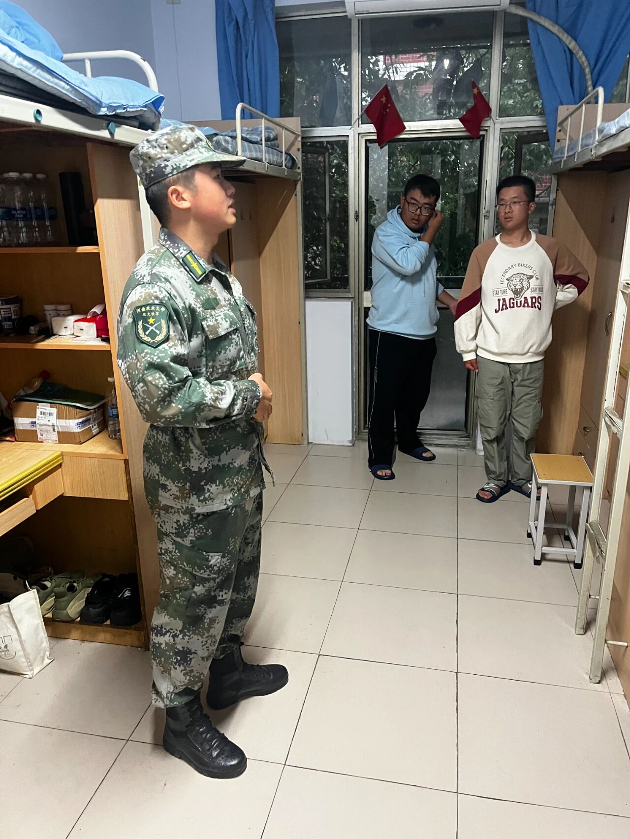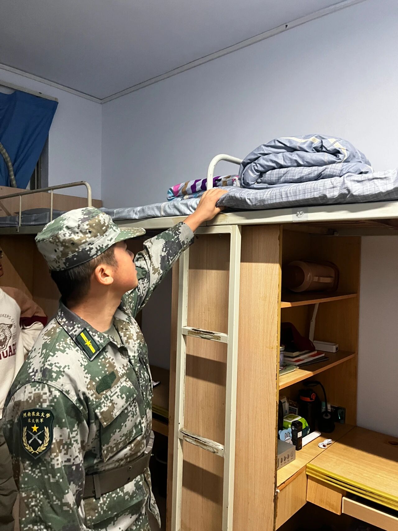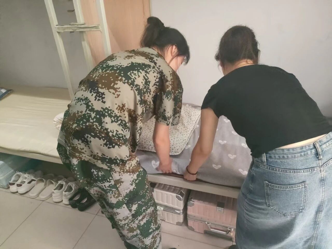 退伍学生李渊、张慧敏、袁亚鑫多次走进新生宿舍,开展了一系列暖心又实用的内务整理教学。