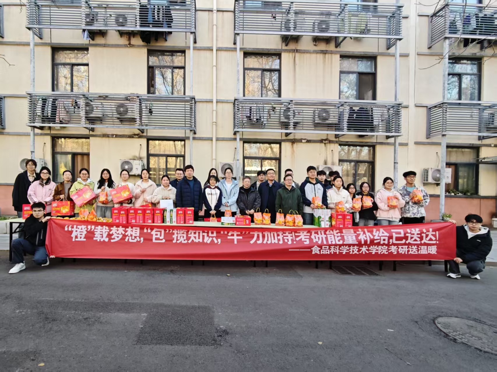 于文化路校区12号楼楼下隆重举办考研送温暖活动。院党委书记吴旭静、党委副书记焦帅、副院长张剑、谢新华、团委书记路平、党委组织员陈翔、团委副书记张金龙及22级全体考研学子共同参与了此次活动。