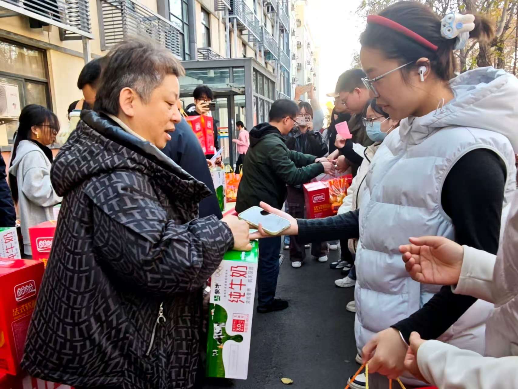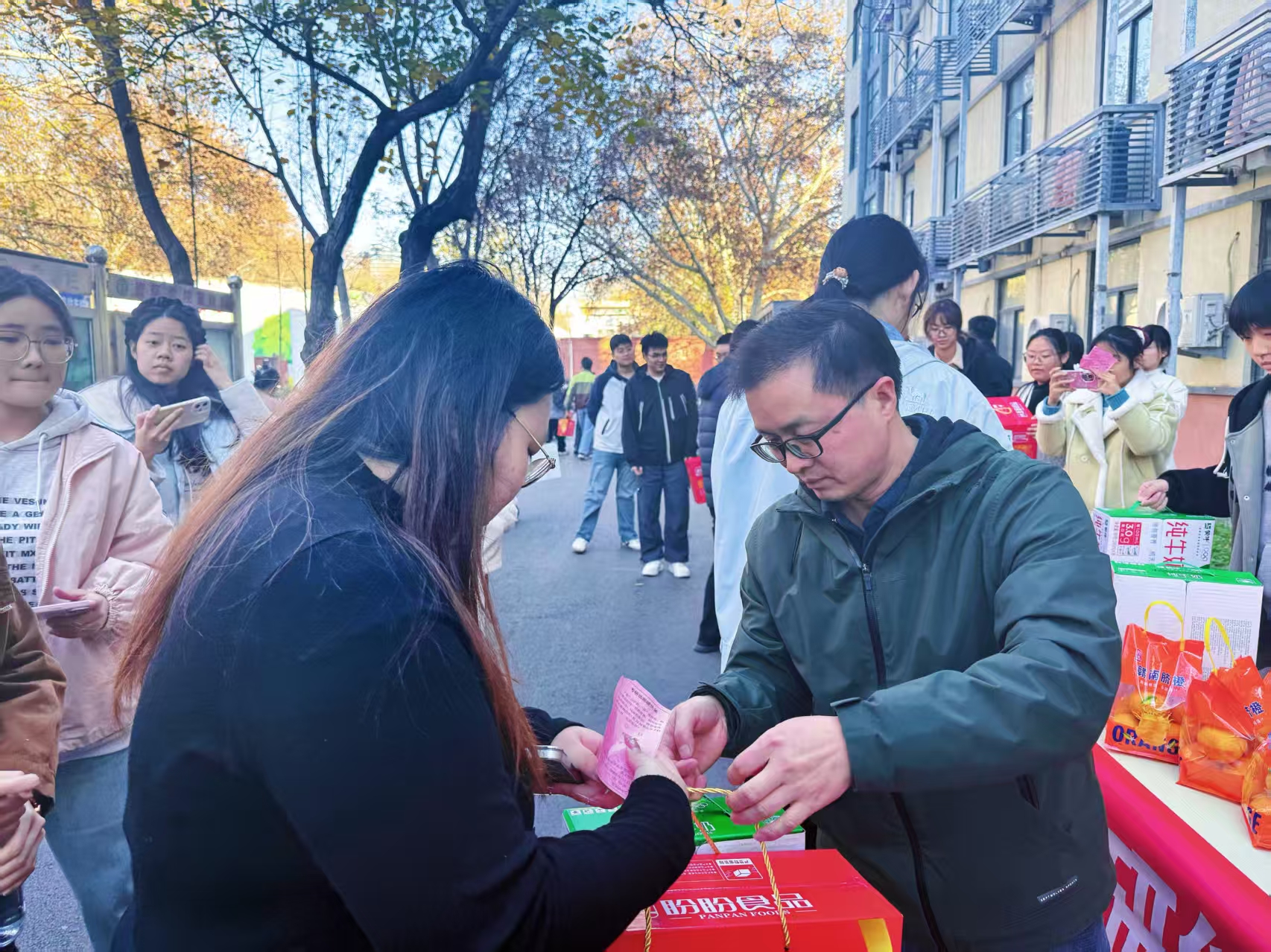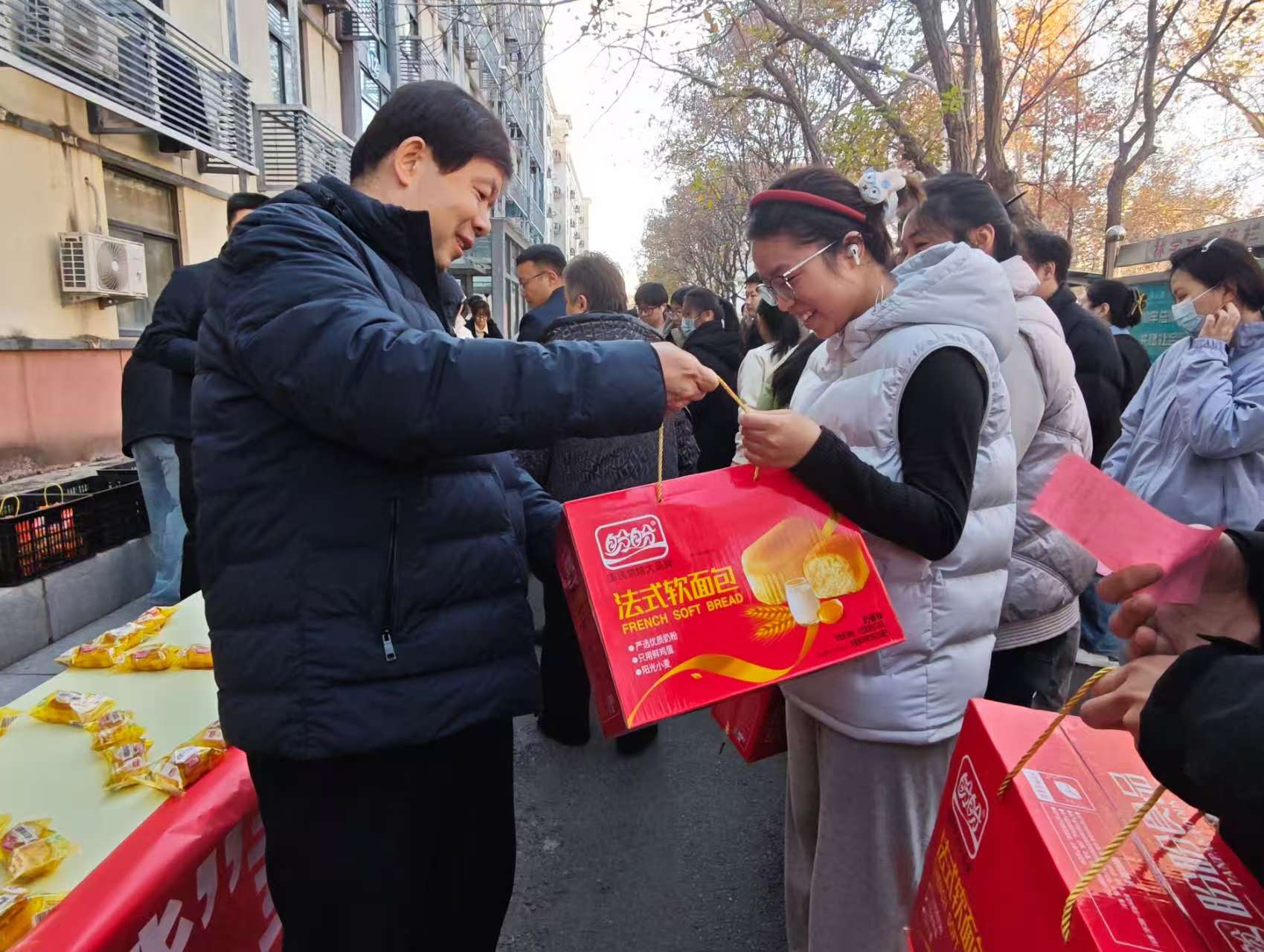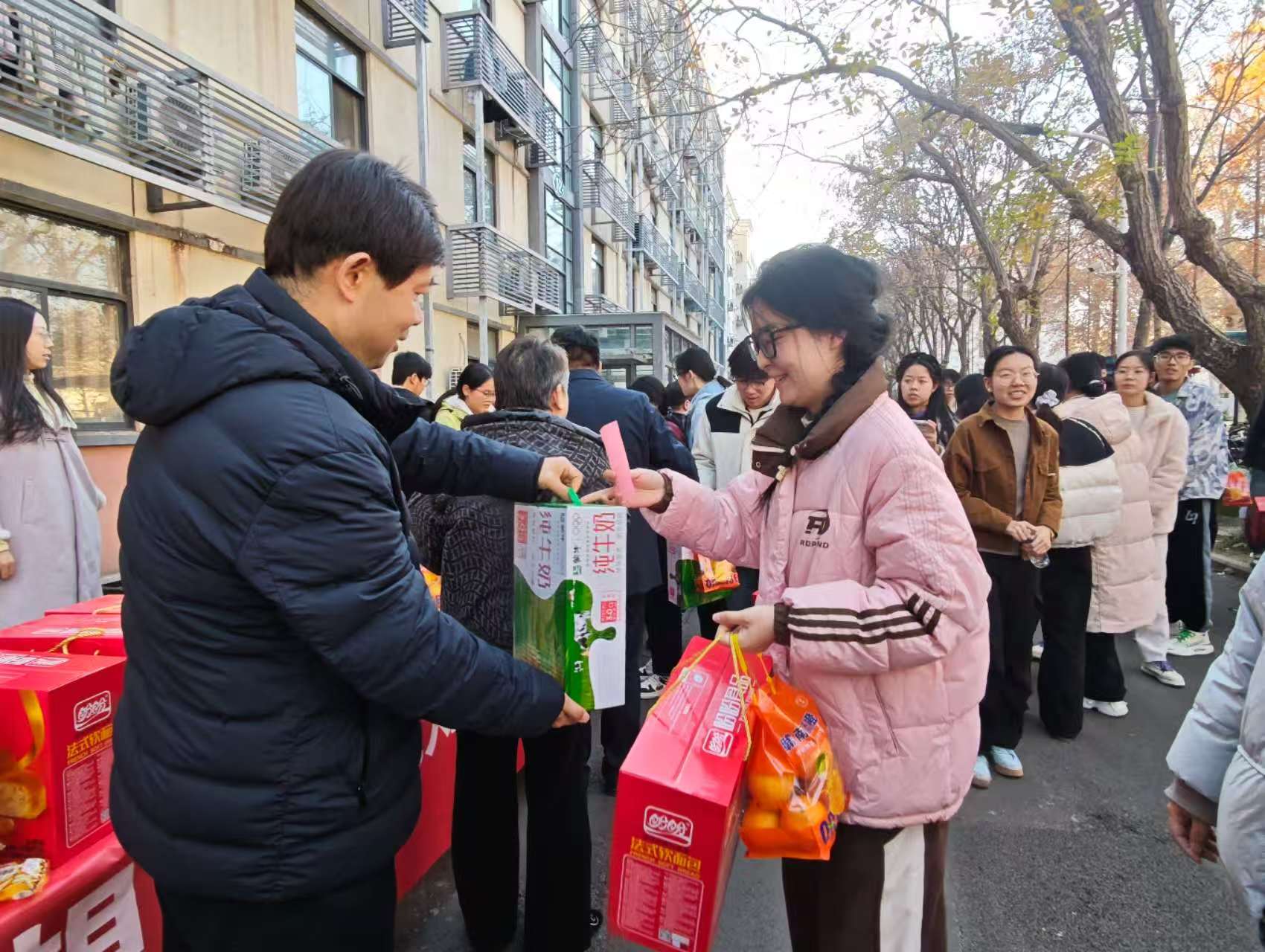最后,领导老师们亲手为同学们送上了精心准备的暖心物资——新鲜饱满的橙子、松软可口的面包与营养醇厚的牛奶。一份份物资承载着澳门银河App