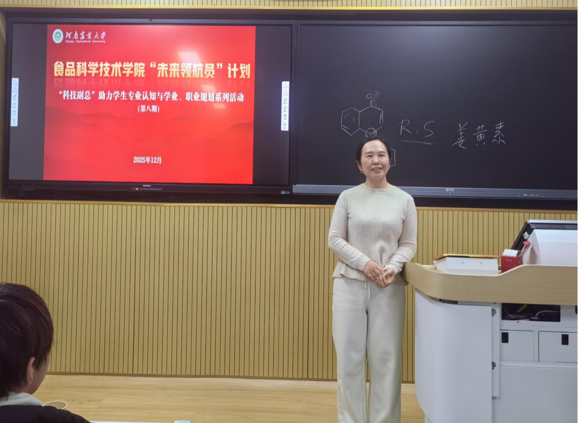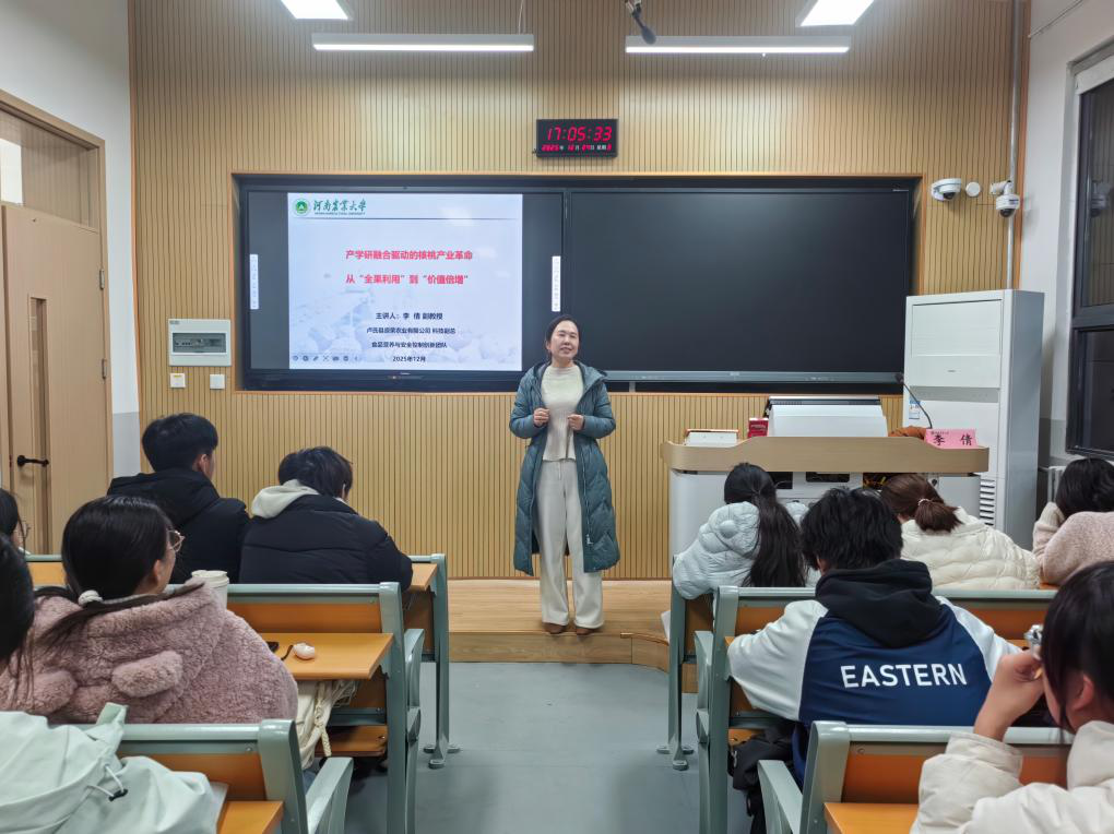 食品营养与安全控制创新团队核心成员、卢氏县原荣农业有限公司科技副总李倩副教授以《产学研融合驱动的核桃产业革命——从“全果利用”到“价值倍增”》为题,为全体新生带来了一场聚焦核桃产业高值化、兼具实践深度与应用价值的专题分享。