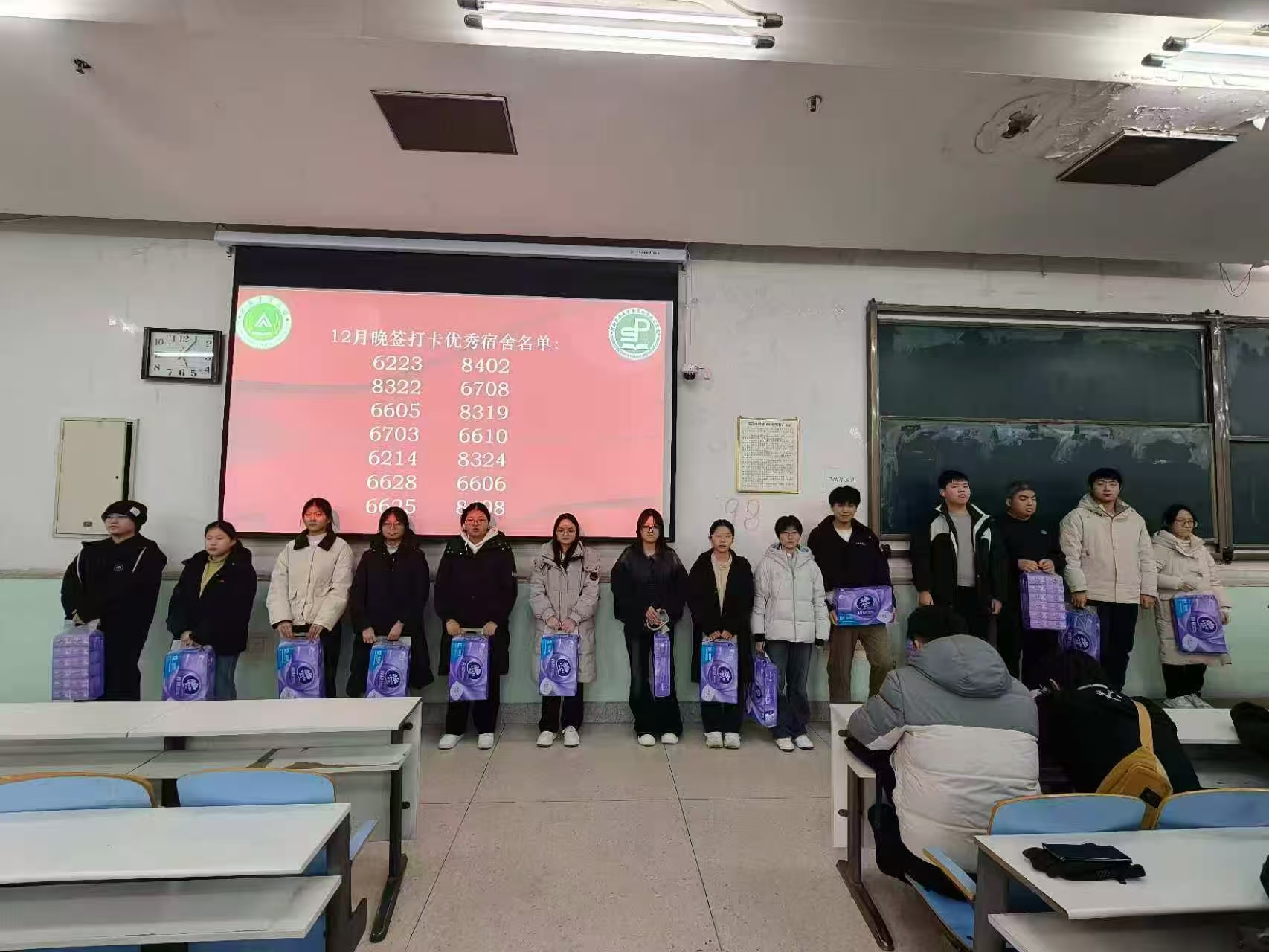 对在晚签打卡中表现突出的“先锋寝室”予以表彰并颁发奖品,以激励同学们保持良好作息,共同营造安全、有序的住宿环境。