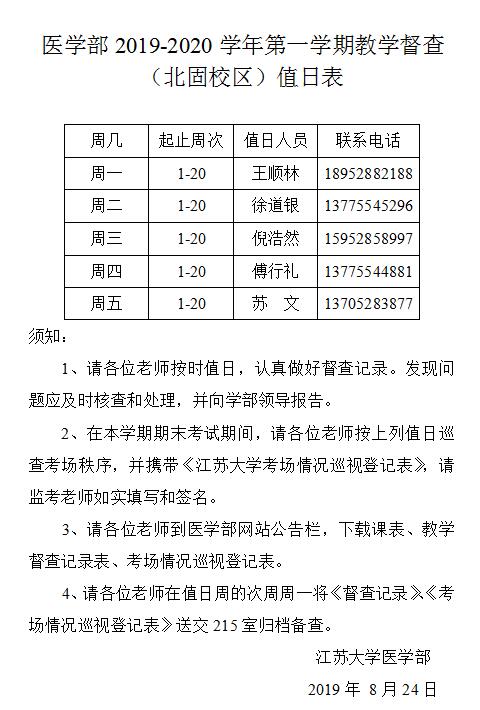 北固校区2019-2020学年第一学期教室课表及医学部教学巡查值日表