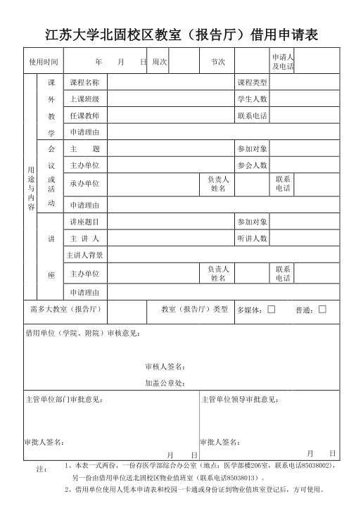 澳门银河app 北固校区教室(报告厅)借用申请表