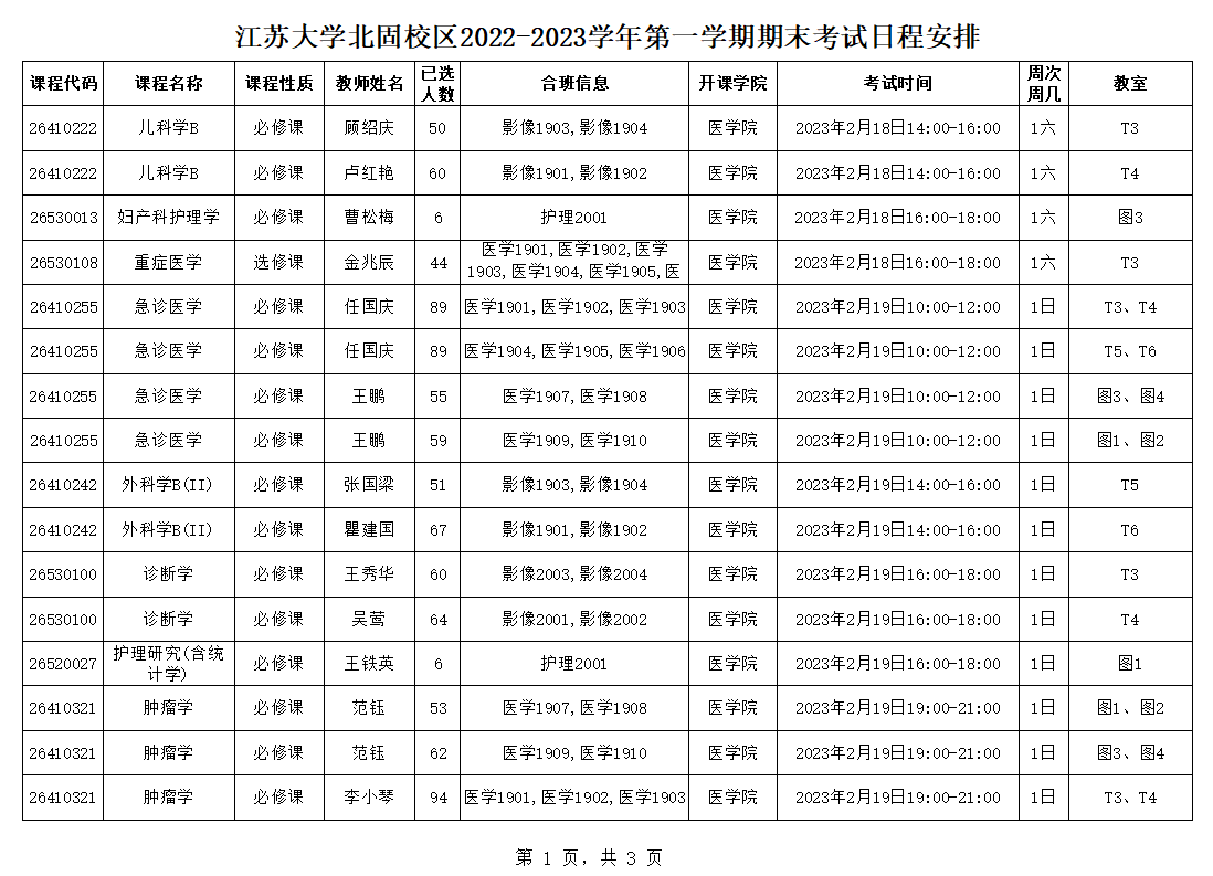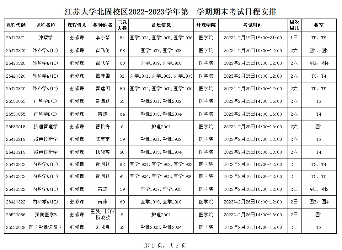 江苏大学北固校区2022-2023学年第一学期期末考试日程安排(2.11)